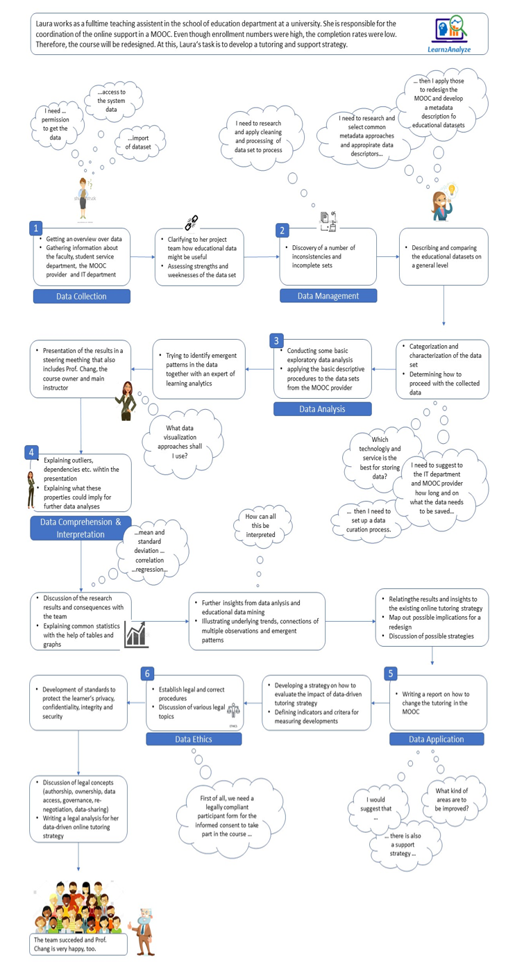 The following use-cases show in the form of an infographic how competences in educational data analytics can help the three target groups School Teachers in K12 Blended Courses, Instructional Designers in a corporate context and e-Trainers in a Higher Education context.